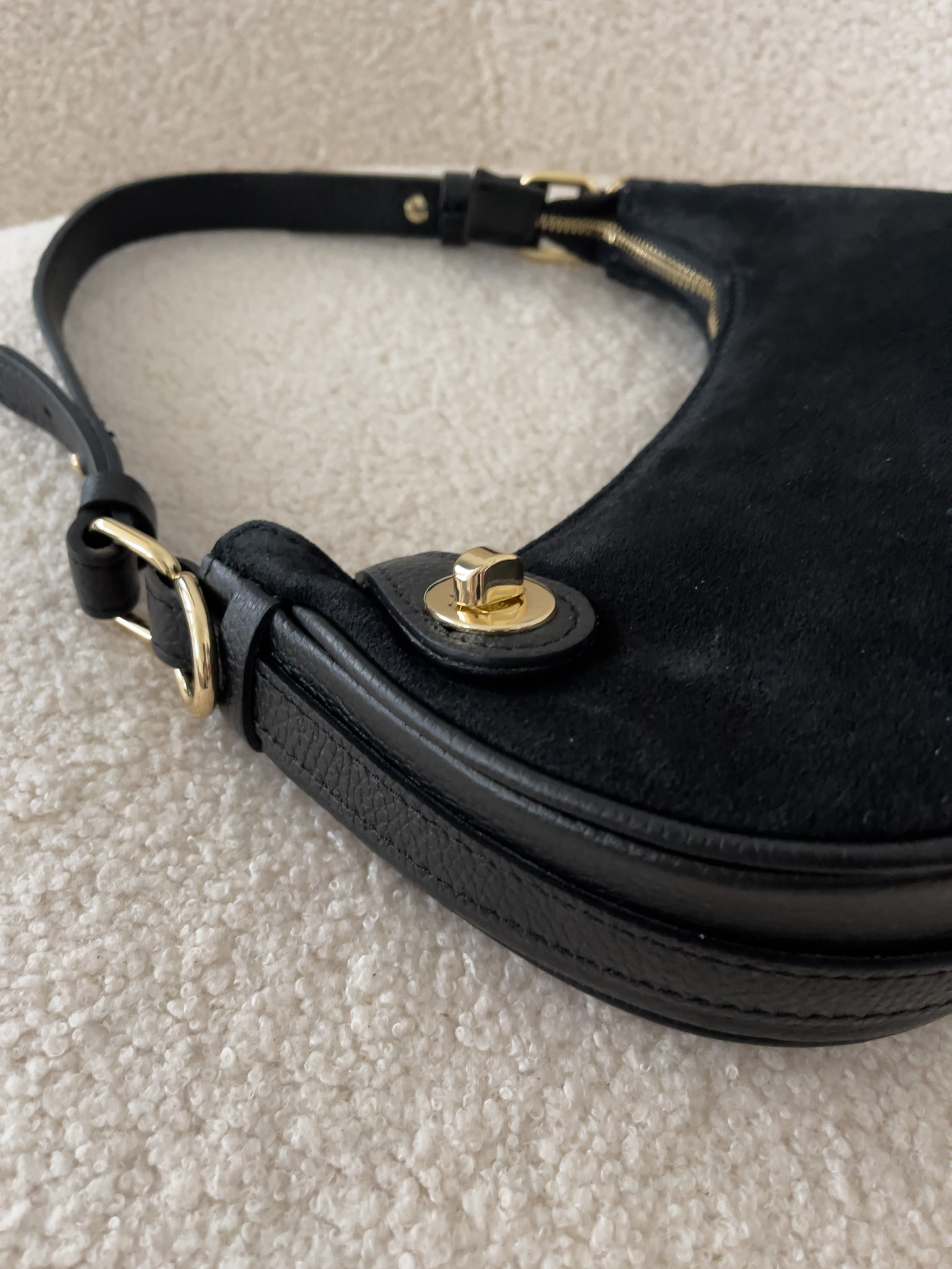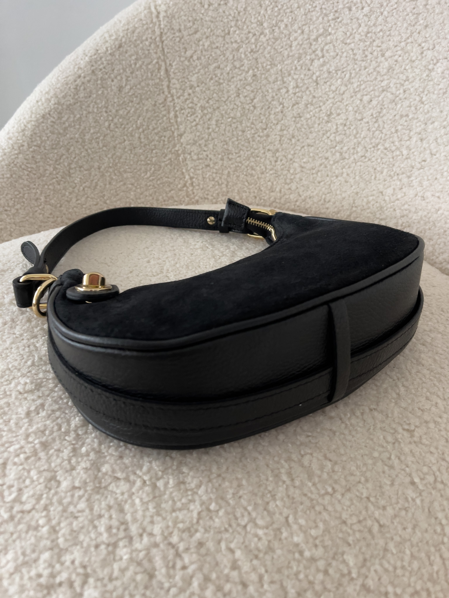 Mini Croissant Bag je síce kompaktná, no ponúka dostatok miesta na všetky dôležité veci. Vo vnútri sa nachádza bočné vrecko na zips, kde bezpečne uschováte drobnosti, a hlavný priestor určený na váš telefón, peňaženku, kľúče či kozmetické doplnky.