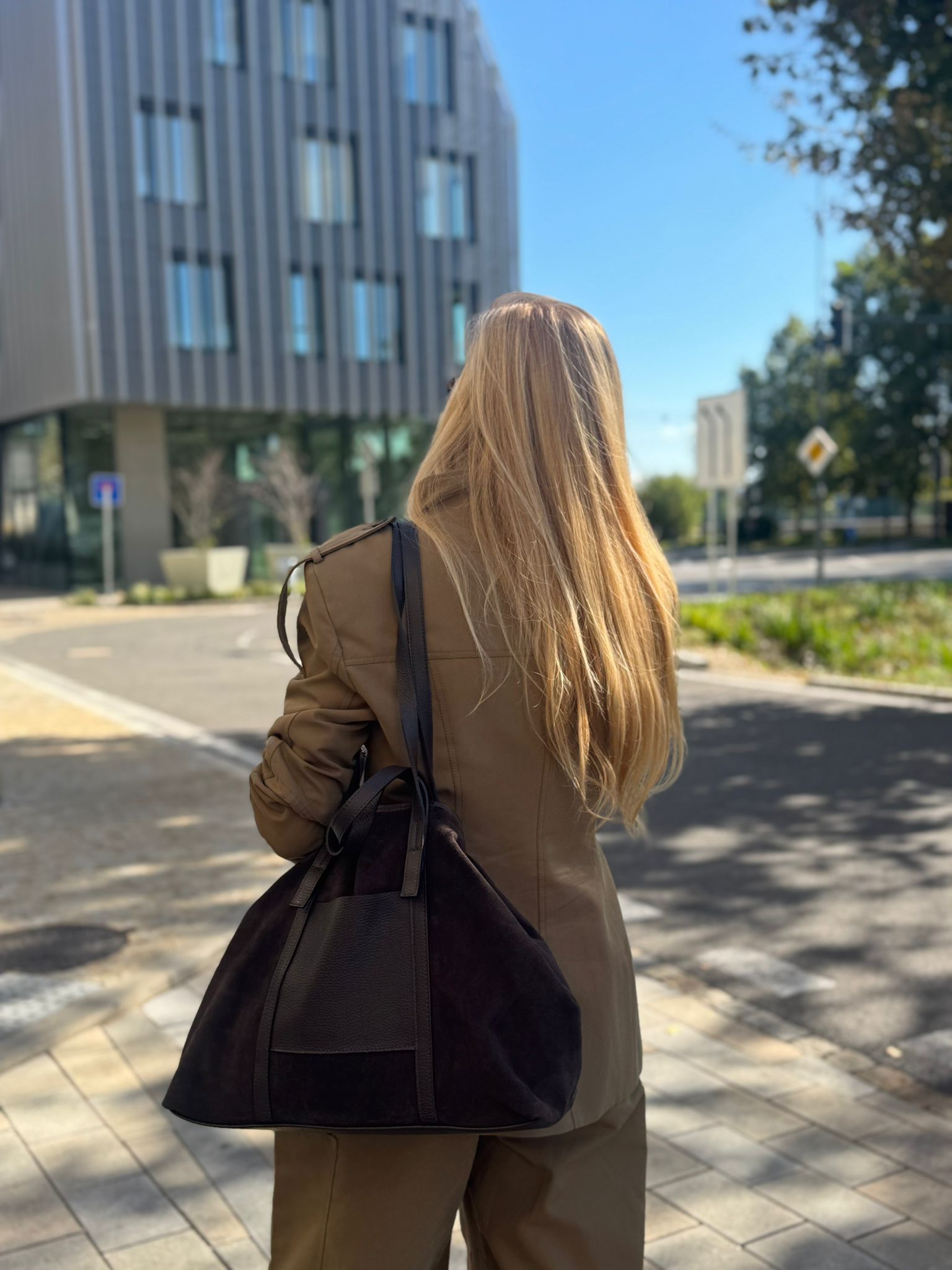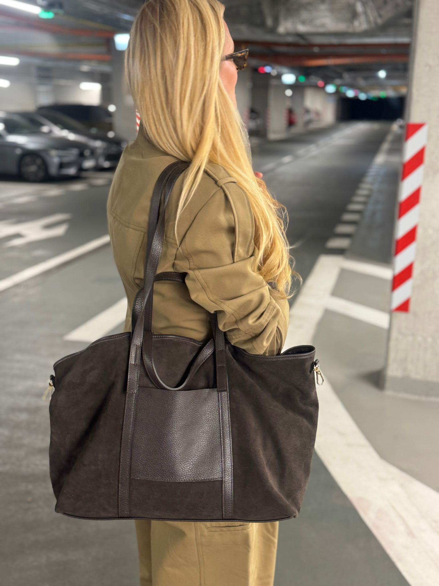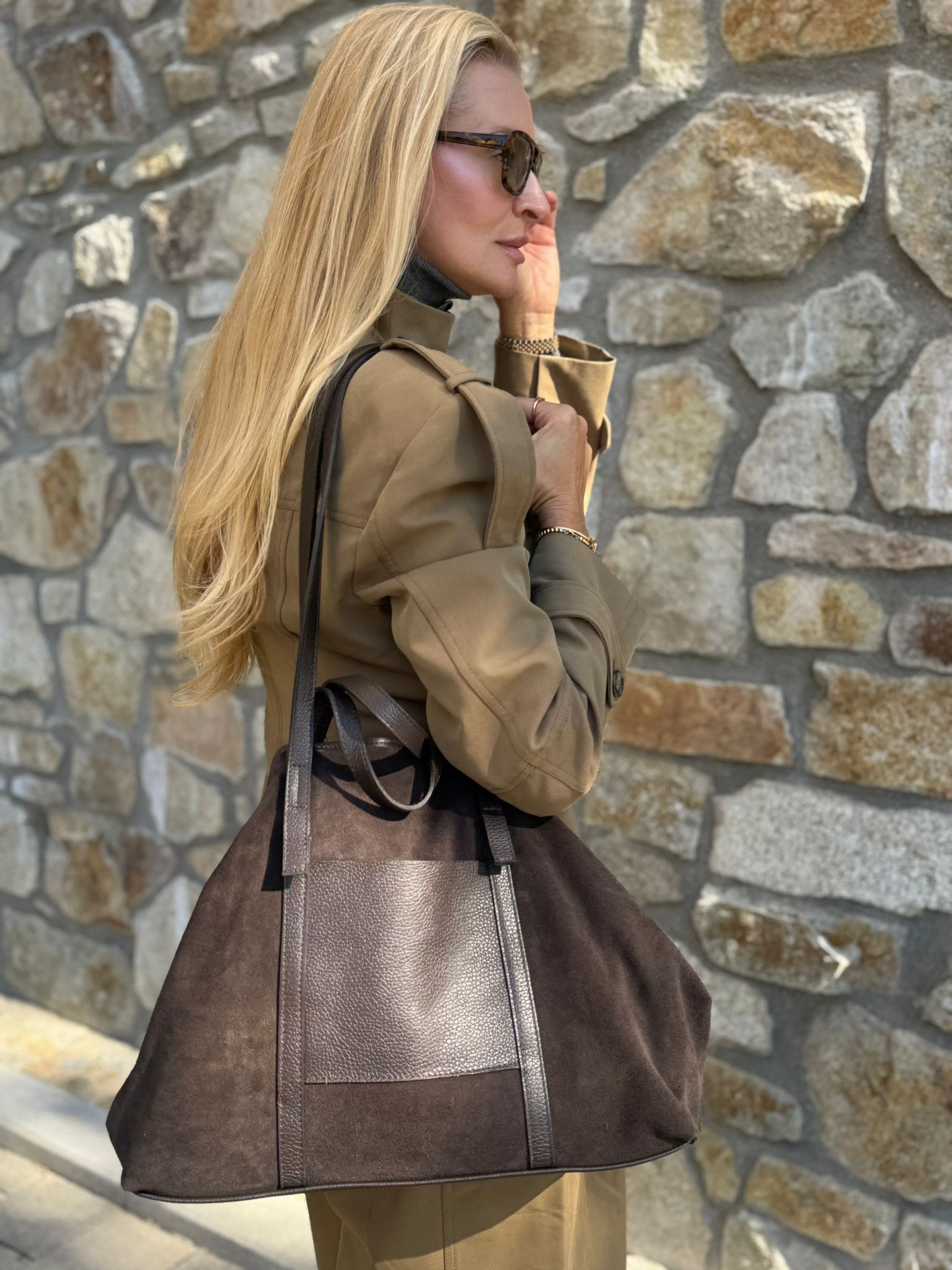Zoznám sa s The Everyday Bag – kabelkou, ktorá ťa sprevádza každý deň, kamkoľvek ideš. Vyrobená z luxusnej kombinácie brúsenej a hladkej kože, spája v sebe praktickosť a sofistikovaný štýl. Magnetické zapínanie.